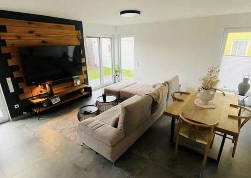 Im Erdgeschoss befindet sich ein großzügiger Wohnbereich (offener Wohn-Ess-Bereich) mit direktem Zugang zur Terrasse.