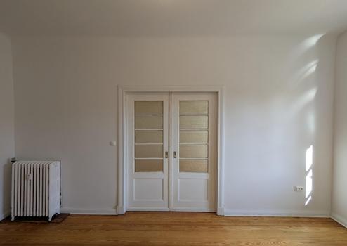 Der Charme von hohen Decken, stilechten Zimmertüren und Terrazzoböden in der Küche und dem Bad werden von der besonderen Ästhetik der in der Wand laufenden Raumtrennenden- Schiebetür abgerundet. Alle Böden im Wohnbereich bestehen aus den originalen Vollholzdielen, welche sich auf der vollen Raumlänge erstrecken.