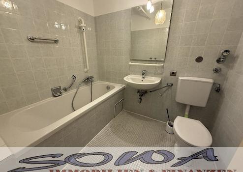 - Badezimmer mit Badewanne, WC und Anschluss für die Waschmaschine