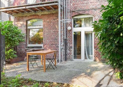 Die Terrasse im Innenhof ist ein idealer Rückzugsort um nach einem stressigen Alltag draußen ein Frühstück in der Sonne oder einen geselligen Grillabend mit Freunden zu genießen.