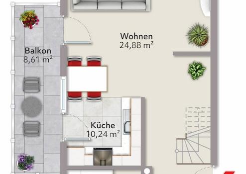 Die Wohnung besteht auf der ersten Etage (2.OG) aus einem Wohn-/Essbereich