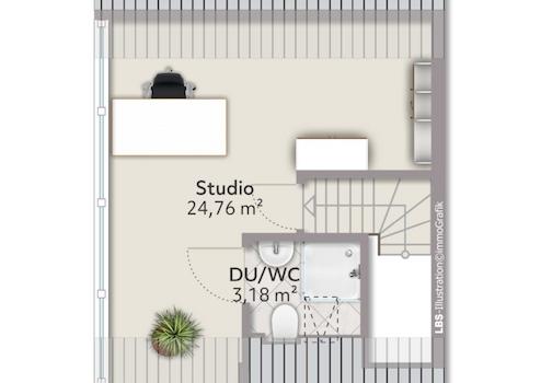 Über einen Treppenaufgang erreicht man das Dachstudio. Hier befinden sich ein Schlafzimmer sowie ein weiteres Bad mit Dusche.