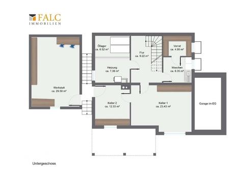 Zusätzlich verfügt das Haus über einen Keller, der nicht nur Stauraum bietet, sondern auch Platz für eine Waschküche und einen großen Hobbyraum, der durch die leichte Hanglage mit normalen Fenster ausgestattet ist und ggf. als großzügiges Spielzimmer Verwendung finden kann. Die gesamte Wohnfläche von 121,84m² bietet genügend Raum für die Bedürfnisse einer jungen Familie.