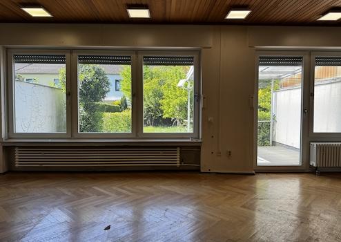 Vom Wohnzimmer aus erreicht man die teilweise überdachte Terrasse und den großzügigen Garten.