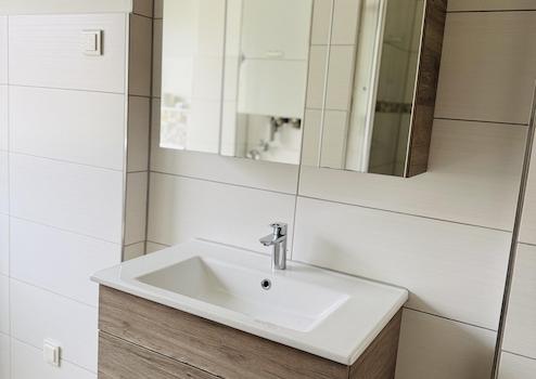 Das moderne Badezimmer ist mit einer Dusche ausgestattet; zudem besteht hier die Möglichkeit, eine Waschmaschine unterzubringen.