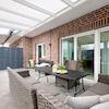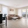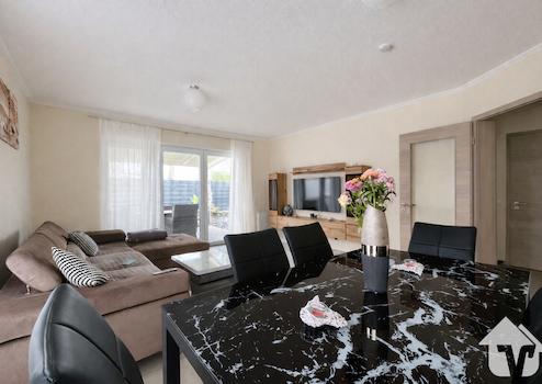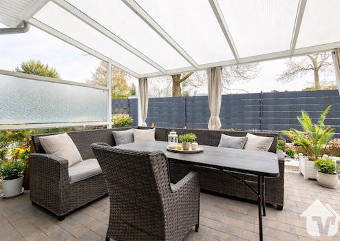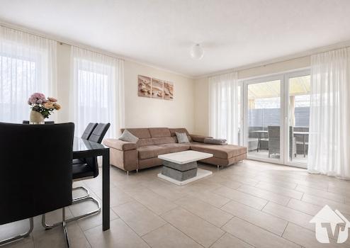 Das Wohnzimmer bildet den zentralen Treffpunkt des Hauses. Von hier aus gelangen Sie direkt auf die überdachte Terrasse, die den Wohnbereich harmonisch nach außen erweitert und einen geschützten Platz für entspannte Stunden im Freien schafft.
