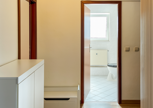 Die Ausstattung umfasst pflegeleichte Bodenbeläge aus Fliesen und Laminat, einen praktischer Abstellraum innerhalb der Wohnung sowie ein zusätzlicher, trockener Kellerraum die ausreichend Stauraum bieten.