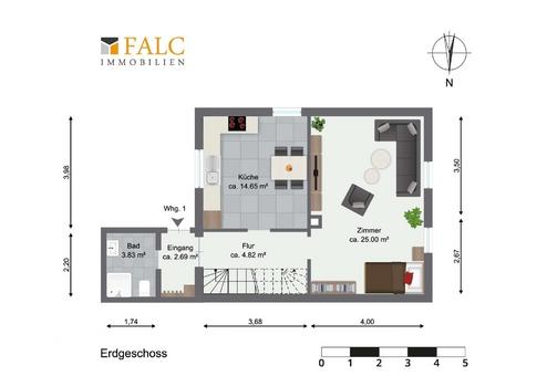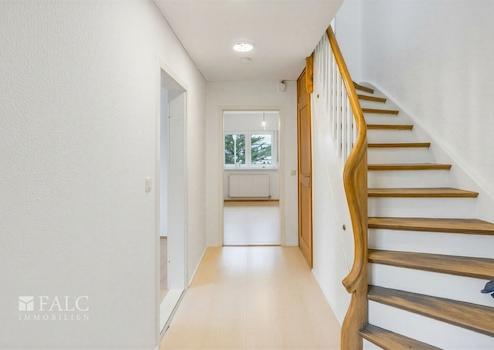 Im Erdgeschoss empfängt Sie ein Eingangsbereich, der in den Flur führt und die Räume angenehm voneinander trennt. Von hier aus erreichen Sie das Badezimmer sowie die Küche und ein großzügig geschnittenes Zimmer, das sich je nach Bedarf als Wohnbereich, Esszimmer oder auch als ruhiger Arbeitsraum nutzen lässt. Die Wege bleiben kurz und nachvollziehbar, wodurch der Alltag im Haus unkompliziert organisiert werden kann.