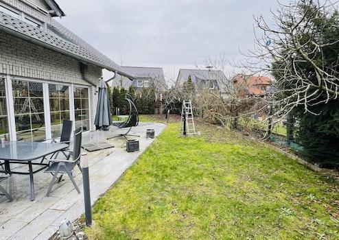 -Terrasse mit Garten und Gartenhaus