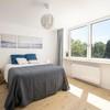Neben einem hellen Bad mit bodengleicher Dusche und Fußbodenheizung verfügt die Wohnung über ein Schlafzimmer mit Blick ins Grüne sowie ein weiteres Zimmer, ideal als Kinderzimmer oder Homeoffice. Mittelpunkt ist der großzügige Wohnbereich mit offener Küche und Essplatz, dessen breite Fensterfront für eine besonders freundliche Atmosphäre sorgt.