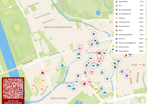 Erholung bieten der Elstermühlgraben (nur 50 m entfernt), der Stadthafen (450 m), der Johannapark (1 km) und der Clara-Zetkin-Park – perfekte Orte für Spaziergänge und Entspannung im Grünen.