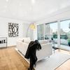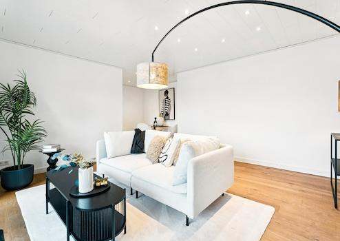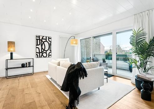 Der Wohnbereich ist in puncto Helligkeit kaum zu schlagen: Eine Panorama-Fensterfront öffnet den Blick auf die XL-Loggia und lässt den Raum strahlen. Hier verbinden sich Behaglichkeit und Komfort. Ein großer Wandheizkörper, integrierte Decken-LEDs sowie das hochwertige Echtholzparkett schaffen ein absolutes Wohlfühlambiente.