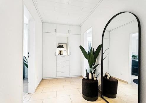 Schon beim Betreten der Wohnung werden Sie von einem großzügigen Eingangsbereich empfangen, der durch Helligkeit und Funktionalität überzeugt. Ein bereits integrierter, hochwertiger Einbauschrank bietet praktischen Stauraum für Garderobe, Schuhe und Haushaltsutensilien – kombiniert mit dekorativen Elementen entsteht so ein harmonisches und aufgeräumtes Gesamtbild.