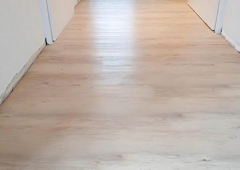 Der Boden ist mit neuem Hartvinyl in der modernen Optik Lärche Melbourne verlegt.