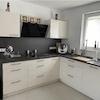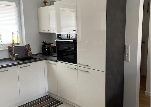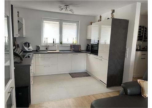 Hier schließt sich die Küche vom Hersteller "Nolte" mit modernen Einbauschränken und Markengeräten von Bosch an, die im ausgewiesenen Mietpreis enthalten ist.