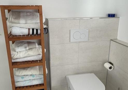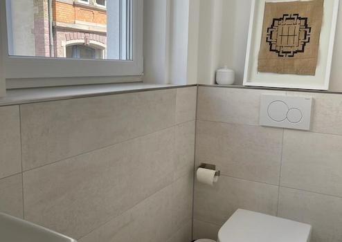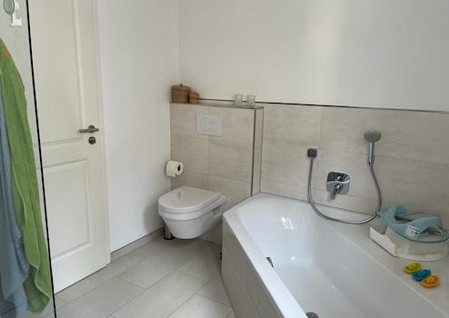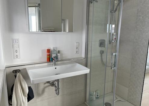 Beide Bäder und das Gäste-WC verfügen über spülrandlose, leicht zu reinigende WC´s, große, flache Duschwannen mit Echtglasduschabtrennungen und Tageslicht. Sie präsentieren sich hell und modern.