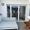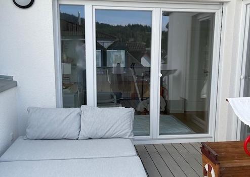 Der im ersten Obergeschoß gelegene Südwest-Balkon wird über eine große Glasfront mit doppelflügligen Balkontüren erreicht und liegt direkt vor dem offenen Wohnraum.