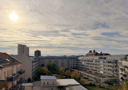 Bereits beim Betreten empfängt Sie ein großzügiger, offener Flurbereich, der nahtlos in den hellen Wohn- und Essbereich übergeht. Von hier aus genießen Sie einen hervorragenden Blick über die Dächer der Stadt. Das Schlafzimmer bietet ebenfalls eine wunderbare Aussicht und überzeugt durch seine angenehme Größe mit ausreichend Platz für ein großes Bett und Kleiderschränke.