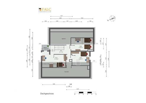 Im ausgebauten Dachgeschoss befinden sich drei Schlafzimmer, eines davon mit Zugang zu einem kleinen Balkon. Zwei große Dachspeicher bieten Stauraum.