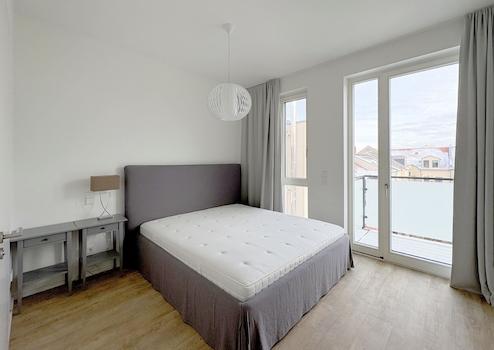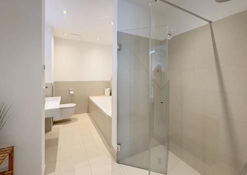 Das Schlafzimmer präsentiert sich als private Ruheoase. Direkt angeschlossen befindet sich das stilvolle Bad en suite mit großzügiger, ebenerdiger Dusche und komfortabler Badewanne – eine kleine Wellnesswelt im eigenen Zuhause. Vom Schlafzimmer aus betreten Sie zudem den ostseitigen Balkon. Beginnen Sie hier den Tag mit den ersten Sonnenstrahlen und einer Tasse Kaffee in der Morgensonne.