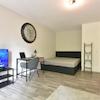 Die Wohnung ist voll möbliert und ausgestattet mit einem komfortablen Boxspringbett, einem Sofa mit zusätzlicher Schlaffunktion für einen Gast, einem Schreibtisch sowie einem Fernseher.