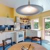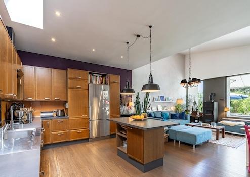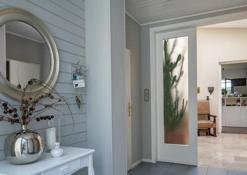 Hauptwohnung (185 m²): lichtdurchflutete Räume mit großen Fensterfronten und zwei Decken-Oberlichtern. Neu gestaltetes Bad im Retro-Design mit Badewanne und bodengleicher Dusche. Ganzjährig nutzbarer, beheizter Wintergarten mit Ausblick ins Grüne.
