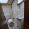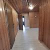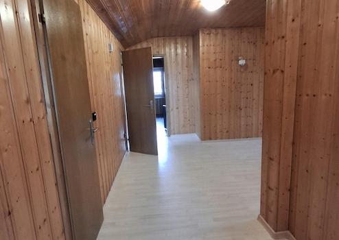 Wände und Decken aus hellem Fichtenholz und Laminatböden gehören zu dieser gemütlichen Wonung.