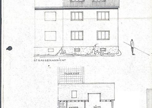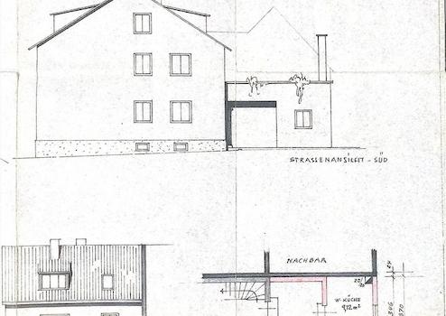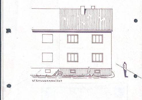 Das Haus wurde 1955 mit Steinwänden erbaut. Die Decke vom Keller zum Erdgeschoss ist aus Beton. Die Decke vom Erdgeschoss zum I. OG und die Decke vom I. OG zum DG bestehen aus Holzbalken. 1958 wurde das Wohnhaus um einen Anbau (Terrasse, Waschküche, Windfang) erweitert. Im DG wurden 1958 jeweils eine Dachgaube im Schlaf- und Wohnzimmer sowie in der Küche/Esszimmer eingebaut.