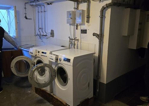 Im Keller steht ein Waschraum mit Münzwaschmaschinen zur Verfügung.