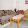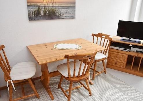 Wohnzimmer 16 qm mit Schlafsofa, Couchtisch, 2 Sessel, Sideboard, Sat-TV, Esstisch und 3 Stühle, Teppichboden.