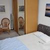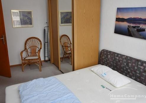 Schlafzimmer 12 qm mit Bett 120 x 200 cm, Schrank, Teppichboden.