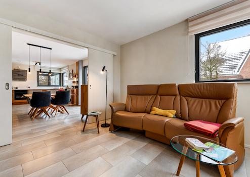 • Wohnzimmer gefliest, aufgeteilt in zwei Wohnbereiche, Kaminofen