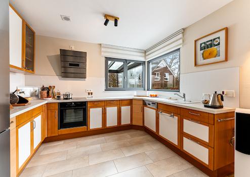 • offene Küche mit Holzfronten und Vollausstattung, offener Essbereich, Zugang in das Wohnzimmer und in den Garten