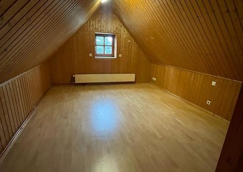 Durch den Eingang gelangen Sie in das gemütliche Treppenhaus, dass viel Platz im Erdgeschoss bietet. Über die Treppe kommen Sie dann in den großen Flur der Wohnung, der sich gut für Garderobe eignet. Die 5 Zimmer Wohneinheit teilt sich auf in drei Schlafzimmer, ausgebauten Dachboden (Mansarde), Wohn- Esszimmer, Bad (mit Dusche und Badewanne) sowie in eine vollausgestattete Küche mit Zugang zur Speisekammer. In das gemütliche, beheizte, in Holz erstellte und über eine Tür erreichbare Dachbodenzimmer gelangen Sie über eine kleine Treppe im Flur.