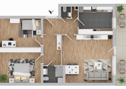 Zwei gut geschnittene Schlafzimmer ermöglichen vielseitige Nutzungsmöglichkeiten, z. B. als Schlaf-, Kinder- oder Arbeitszimmer.