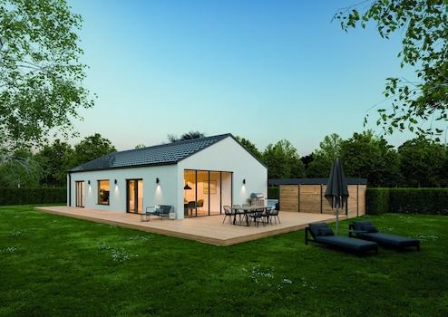 Dieser Bungalow bietet eine außergewöhnlich kluge und moderne Grundrissgestaltung, die begeistert. Optional ist dieser Entwurf auf Anfrage mit einer 4-teiligen rahmenlosen Schiebetüranlage verfügbar.