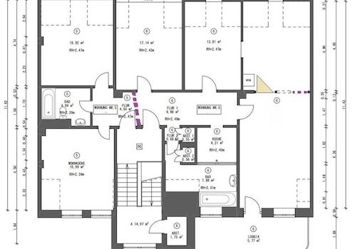 + Eine Wand mit Tür wird noch in der rechten Wohnung eingebaut (gestrichelte Linie)