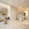 Über die Treppe gelangen Sie in das Herz der Immobilie: den großzügigen Wohn- und Essbereich sowie die angrenzende Küche. Auf der linken Seite empfängt Sie ein repräsentativer Bereich zur Begrüßung Ihrer Gäste. Hier befindet sich eine offen gestaltete Garderobe mit einem Einbauschrank aus Glasvitrinen. Direkt angrenzend liegt das praktische Gäste-WC mit Eck-Waschbecken und Fenster, welches für angenehmes Tageslicht und optimale Lüftungsmöglichkeiten sorgt.