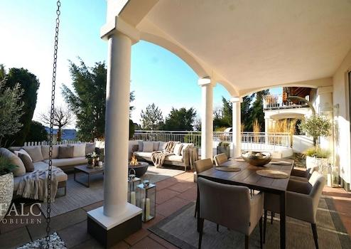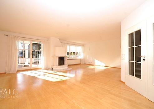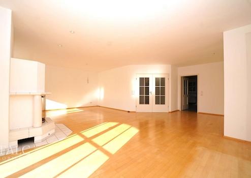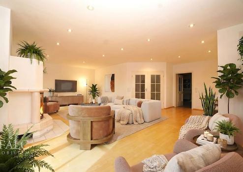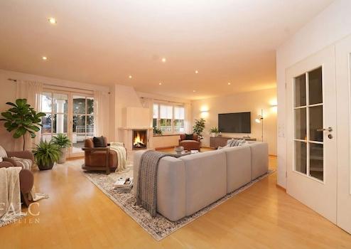 Über die Küche gelangen Sie in den lichtdurchfluteten Wohn- und Essbereich, das Herzstück Ihres neuen Eigenheims mit attraktiver Südausrichtung. Zahlreiche Einbaustrahler sorgen für eine angenehme Atmosphäre. Mit einer beeindruckenden Fläche von ca. 51 m², hochwertigem Echtholzparkett und einem Kachelofen, der den Bereich zusätzlich beheizt, wird dieser Raum zum Herzstück der Wohnung. Ein besonderes Highlight ist die steingeflieste Terrasse mit stilvollen Säulen, die einen charaktervollen und einladenden Blick bietet. Ergänzende Gartenflächen laden zu individuellen Gestaltungen ein.