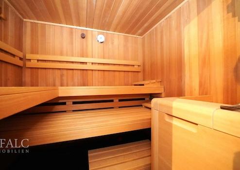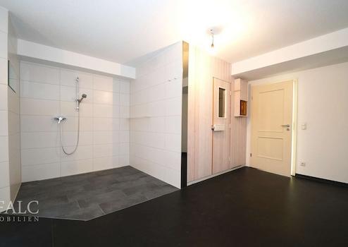 Der großzügige, helle Flurbereich ist mit hochwertigen Natursteinfliesen in eleganter Carrara-Optik ausgestattet und harmoniert optisch perfekt mit dem Treppenbereich. Die Waschküche bietet außergewöhnlich viel Platz und verfügt über einen separaten Waschbeckenbereich. Durchdacht geplante und gut erhaltene Einbauschränke sorgen für zusätzlichen Stauraum. Angrenzend befindet sich die Garage, die ebenfalls gefliest ist und über ein elektrisch betriebenes Garagentor verfügt. Der Wellnessbereich lädt mit viel Platz zu erholsamen Stunden ein. Die gepflegte Sauna bietet Raum für bis zu vier Personen. Die angrenzende Dusche überzeugt durch pflegeleichte Fliesen und eine großzügige Gestaltung. Im Heizraum befindet sich eine Gas-Brennwertheizung der Marke Viessmann aus dem Baujahr 2006 mit einem neu eingebauten Kessel aus dem Jahr 2007. Zudem ist eine Wasserfilteranlage vorhanden.