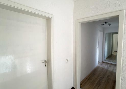 Über einen straßenseitig gelegenen Hauseingang gelangen Sie in das Treppenhaus mit Holztreppe ins Ober- und Dachgeschoss.