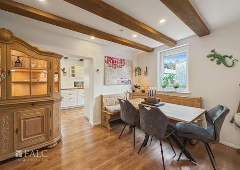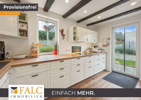 Die moderne, großzügig gestaltete Küche ist harmonisch in diesen Wohn-/ Essbereich eingebunden und überzeugt durch kurze Wege im Alltag. Von hier öffnet sich der Zugang zur Terrasse und in den Garten, wodurch sich der Wohnraum in den warmen Monaten ganz selbstverständlich nach draußen erweitert. Ideal für Mahlzeiten im Freien, entspannte Stunden oder um Kinder beim Spielen im Blick zu behalten.