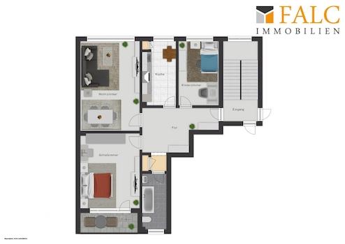 - Aufteilung: drei Zimmer sowie Küche, Diele, Tageslichtbad, Abstellraum und Loggia