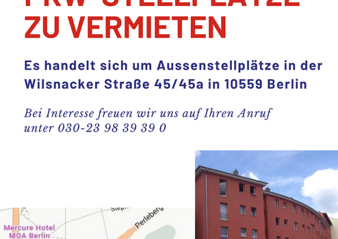 n der Wilsnacker Straße 45, 10559 Berlin (Stadtteil Moabit), steht ab sofort ein Außenstellplatz zur Vermietung. Der Stellplatz befindet sich in einem ruhigen Innenhof und ist gut zugänglich. Er eignet sich ideal für ...