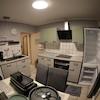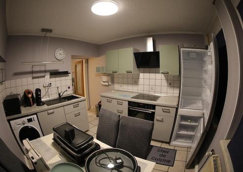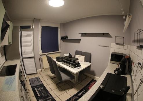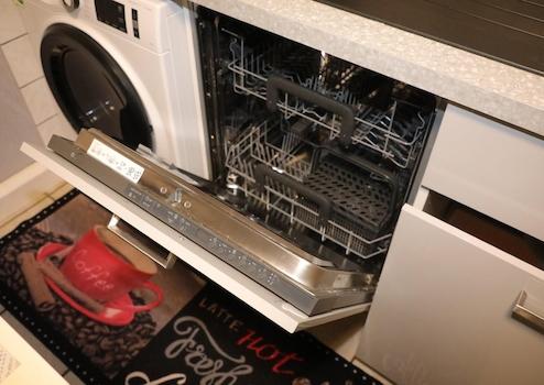 Ausstattung der Einbauküche: Herd, Backofen, Kühlschrank, Gefrierschrank, Spülmaschine, Geschirr, Besteck, Töpfe, Küchenutensilien, Mikrowelle, Heißluftfritteuse, Kaffeemaschine, Toaster, Raclette, Küchenradio usw.