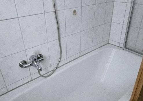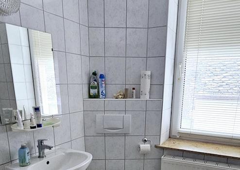 - Badezimmer mit Fenster, Dusche und Badewanne