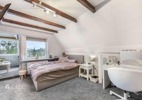 Im Obergeschoss erwarten Sie ein ruhiger Elternbereich sowie ein außergewöhnlich großes Kinderzimmer mit viel Raum zum Spielen, Lernen und Entfalten.