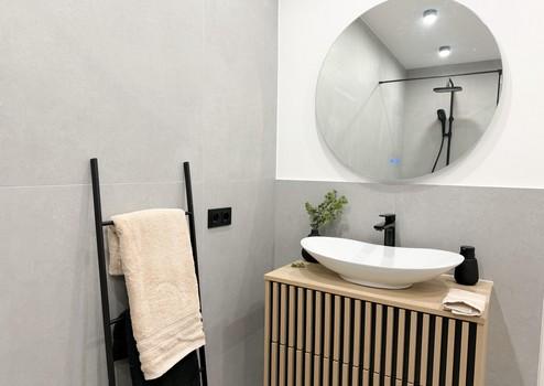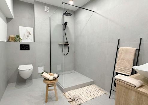 Edle, großformatige Fliesen in den Badezimmern