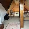 Ein repräsentativer Eingangsbereich führt in das lichtdurchflutete Galerie-Wohnzimmer mit Speckstein-Kaminofen. Die Küche mit einer neuwertigen Einbauküche im Wert von ca. 8.500,- €, ein Gäste- oder Hauswirtschaftszimmer sowie der Schlaf- und Studiobereich mit zusätzlichem Zimmer und separater Toilette bieten vielseitige Nutzungsmöglichkeiten.
