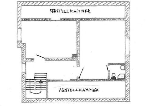Über eine Treppe innerhalb der Wohnung erreicht man das Dachgeschoß (in offener Bauweise bezüglich des Daches, Höhe vom Boden bis zur Spitze des Daches ca. 3,10 m), mit 2 großen Zimmern und einem Gäste-Bad. Tatsächliche Fläche wie im OG, für die Mietberechnung wurden Kammern und schräge Wände mindernd berücksichtigt.